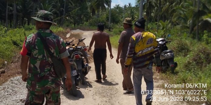 Kateman — Bintara Pembinas Desa (Babinsa) Koramil 06/Kateman, Kodim 0314/Inhil. Serda Lendi Fetter Sirimba melakukan patroli kebakaran hutan dan lahan (karhutla) di desa Air Tawar,, kecamatan Kateman, kabupaten Indragiri Hilir, provinsi Riau, Rabu (27/6/2023) pagi.
