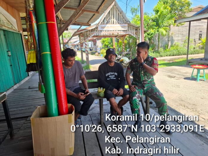 Pelangiran, – Babinsa Koramil 10/Pelangiran, Pratu Mukhlis, melaksanakan kegiatan Komunikasi Sosial (Komsos) dengan pedagang yang datang dari Kecamatan Pelangiran. Kegiatan ini dilaksanakan sebagai bagian dari upaya Babinsa untuk mempererat jalinan komunikasi antara TNI dan masyarakat, serta untuk meningkatkan kewaspadaan terhadap situasi dan kondisi keamanan di sekitar wilayah desa binaan.