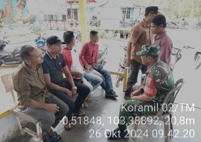 Tampak Babinsa Serka P Siregar saat melaksanakan kegiatan komunikasi sosial (komsos) berada di Desa Tanah Merah, kecamatan Tanah Merah, kabupaten Indragiri Hilir, pada sabtu (26/10/2024).