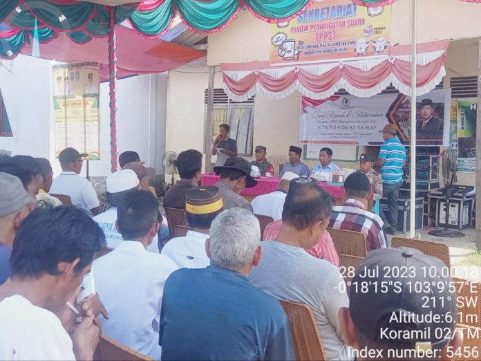 ENOK – Bintara Pembina Desa (Babinsa) komando Rayon Militer (Koramil) 02/Tanah Merah (TM) mengahdiri acara tamu ramah dan silaturahmi dalam rangka reses II MP II Tahun 2023 anggota dewan perwakilan rakyat Daerah (DPRD) kab Inhil. Taufik Hidayat, SH M.AP. di desa Simpang Tiga, kecamatan Enok, kabupaten Indragiri Hilir, Jum’at (28/7/2023) pagi.