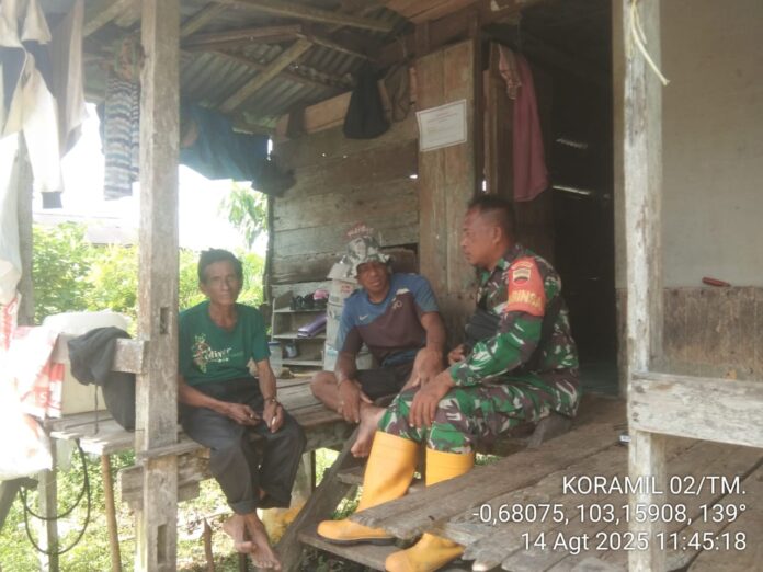 Tanah Merah, – Babinsa Desa Sungai Laut, Koramil 02/TM, Serda AH. Kumbara, melaksanakan kegiatan komunikasi sosial (Komsos) bersama warga binaan di Desa Sungai Laut, Kecamatan Tanah Merah, Kabupaten Indragiri Hilir (Inhil), Kamis (14/8/2025). Kegiatan ini menjadi salah satu upaya Babinsa dalam menjalin hubungan yang harmonis sekaligus mendukung stabilitas keamanan dan ketertiban masyarakat di tingkat desa.