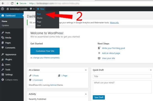 - Setelah masuk ke Dashboard, pilih Posts » Add New atau pilih icon ( + New) pada pojok atas lalu pilih Post.