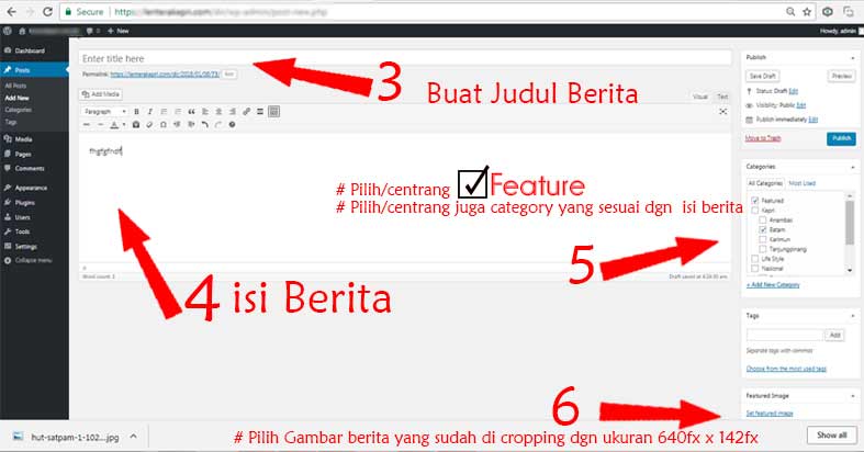 - Halaman ini terdapat kolom untuk menuliskan Judul Posting Anda dan juga Area untuk menulis isi postingan atau yang memuat berita. Kemudian mengelompokkan berita per category.