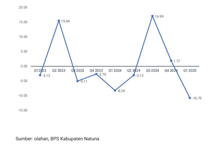 Natuna, Kundurnews.co.id – Kabupaten Natuna mengalami penurunan ekonomi yang signifikan di triwulan I 2025. Berdasarkan data dari Badan Pusat Statistik (BPS) Kabupaten Natuna, ekonomi Kabupaten Natuna mengalami penurunan sebesar 10,79 persen dibandingkan dengan triwulan sebelumnya (q-to-q).