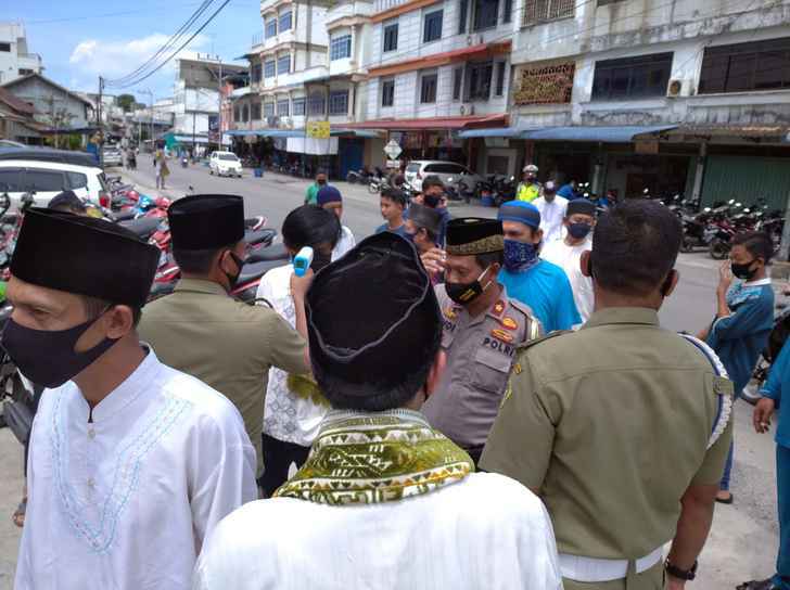 Dalam pantauan, puluhan jemaah antri masuk ke masjid. Satu per-satu jemaah yang masuk dilakukan pemeriksaan suhu tubuh dengan menggunakan Termometer, dan diwajibkan mengenakan masker.