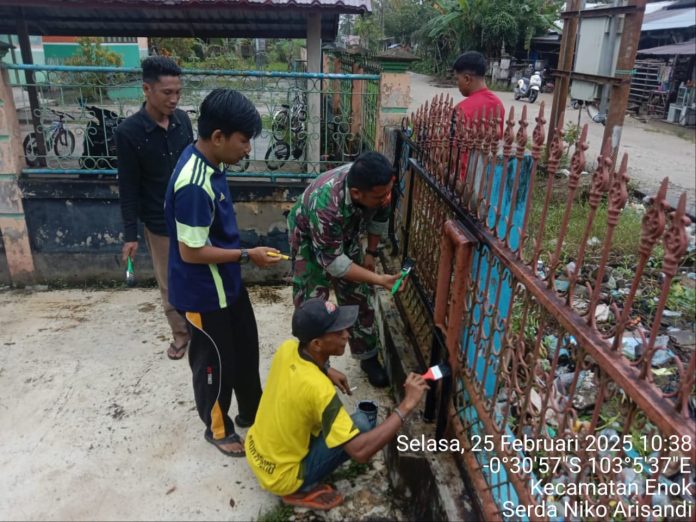 ENOK, – Bintara Pembina Desa (Babinsa) Koramil 02/Tanah Merah (TM), Serda Niko Arisandi, melaksanakan kegiatan gotong royong bersama warga binaan di Dusun Guntung, Desa Pengalihan, Kecamatan Enok, Kabupaten Indragiri Hilir (Inhil), Selasa (25/2/2025). Kegiatan ini dilakukan dalam rangka menyambut bulan suci Ramadhan.