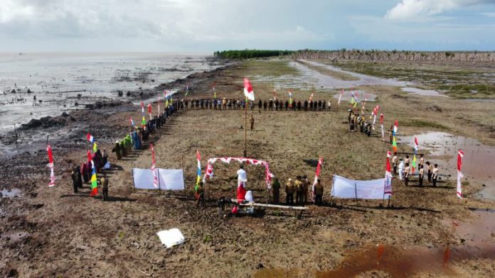 Inhil – Pemerintah Desa Kuala Selat, Kecamatan Kateman, Kabupaten Indragiri Hilir-Riau, melangsungkan upacara bendera merah putih dalam rangka memperingati Hari Ulang Tahun Republik Indonesia (HUT-RI) ke-77, di lahan perkebunan kelapa dengan luas ribuan hektar yang terkena abrasi tahun lalu, Rabu (17 Agustus 2022).