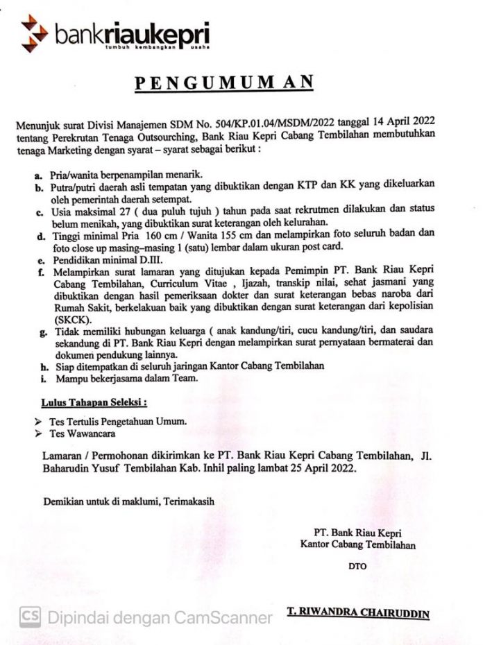 Hal tersebut berdasarkan surat Divisi Manajemen SDM No. 504/KP.01.04/MSDM/2022 tanggal 14 April 2022 tentang perekrutan Tenaga Outsourching, Bank Riau Kepri Cabang Tembilahan membutuhkan