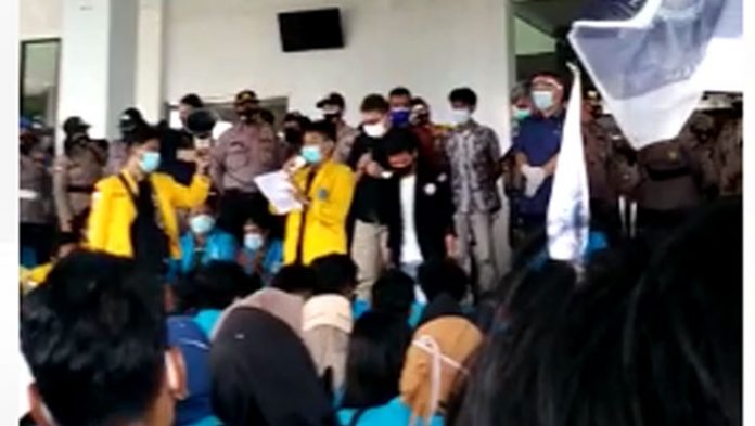 Tanjungpinang – Ratusan mahasiswa Tanjungpinang – Bintan yang tergabung dalam Badan Eksekutif Mahasiswa (BEM), serta puluhan Buruh, melakukan aksi demo menolak Undang-Undang Omnibus Law Cipta Kerja 2020, didepan Kantor Dewan Perwakilan Rakyat Daerah (DPRD) Provinsi Kepri, Kamis (8/10/2020).