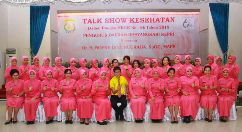 Batam – Sedikitnya 300 anggota Bhayangkari Daerah Kepri mengikuti seminar Kesehatan dalam rangka Hari Kesatuan Gerak Bhayangkari (HKGB) ke-66 tahun, tahun 2018, dengan nara sumber Dr.H. Boyke Dian Nugraha, SpOG, MARS, yang berlangsung di Gedung Lancang Kuning Polda Kepri, Sabtu (15/9/18).