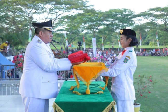 ASAHAN – Petang itu senja beranjak datang, bersiap menggantikan teriknya siang. Namun semangat paskibraka tetap lantang. Pantang lelah sebelum tugas berakhir cemerlang. Sebait itu agaknya dapat menggambarkan bagaimana semangat pasukan pengibar bendera dalam menjalankan tugas pada upacara aubade penurunan bendera dalam rangka peringatan HUT Ke-78 RI di Kabupaten Asahan. Wakil Bupati Asahan bertindak selaku Inspektur Upacara dalam kegiatan yang dilaksanakan di Alun-Alun Rambate Rata Raya Kisaran, Kamis Petang (17/08/2023).