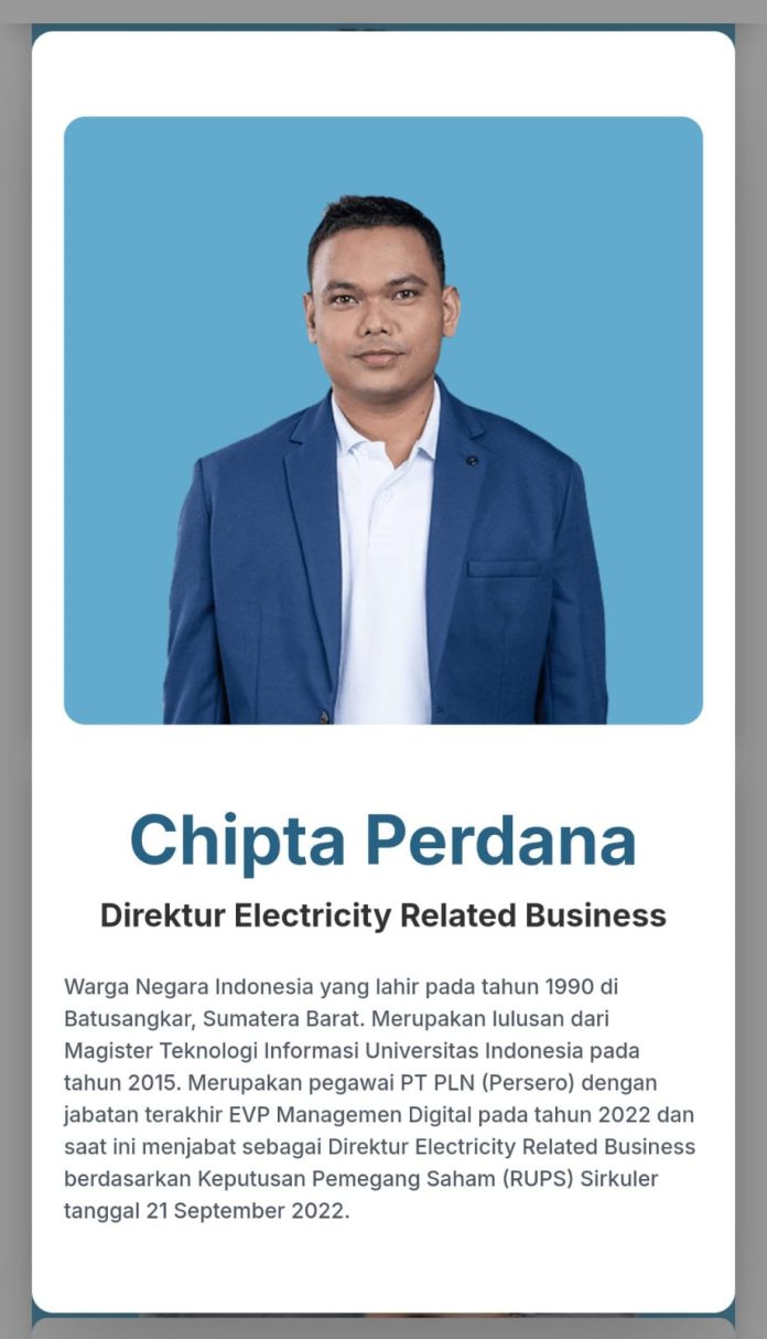 Selain Pratama Adieputra Suseno, nama lain yang kini jadi pergunjingan adalah sosok Chipta Perdana, yang kini menjabat sebagai Direktur Electricity Related Business di PLN Icon Plus.